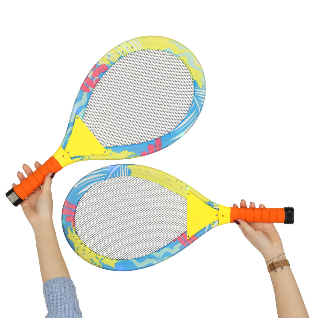 Produkt "RAKIETY TENISOWE ŚWIECĄCE LED + LOTKI" wyróżnia się tym, iż rakiety są podświetlane diodami LED. Rozgrywka po zmroku jest niesamowitym przeżyciem.