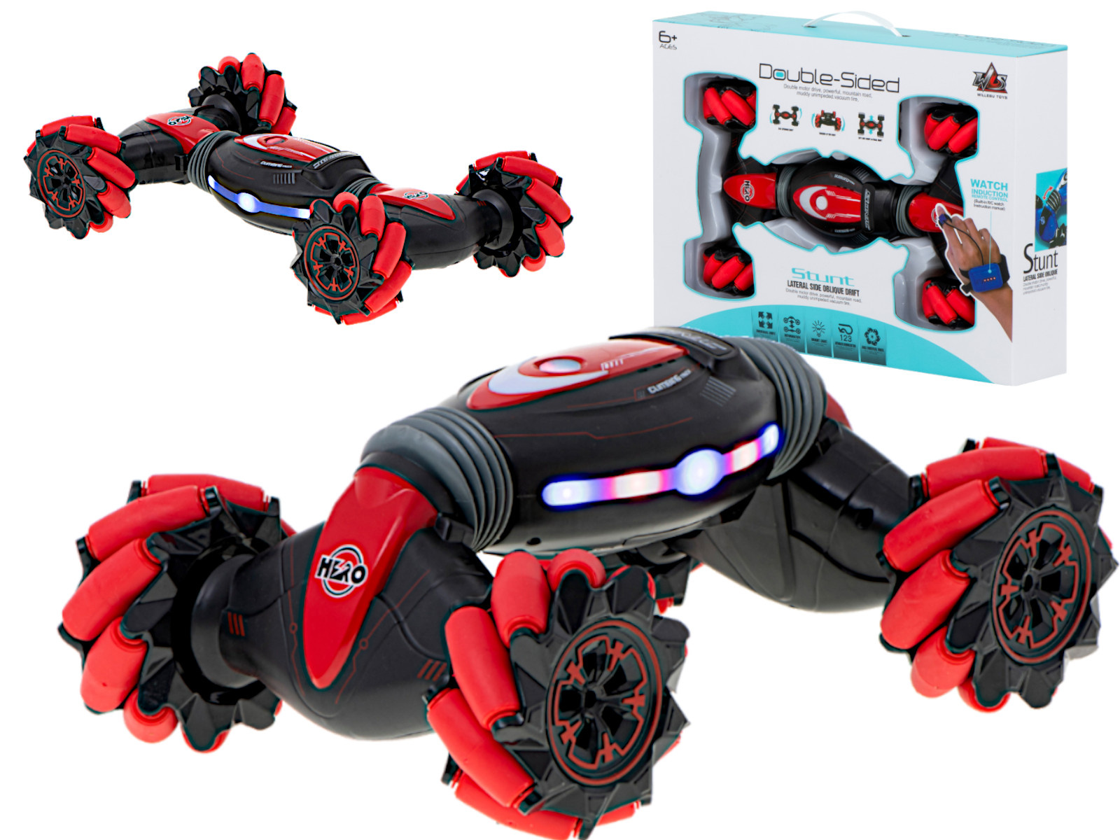 Niepozorny pilot "zegarek" to dodatkowa frajda! Bardzo czuły pilot zakładany na dłoń pozwala sterować autem za pomocą gestów. Umożliwia nie tylko kierowanie pojazdem, ale też zmianę muzyki czy kształtu auta. Sterowanie przy pomocy gestów to świetna zabawa, która wzbudza zachwyt w obserwatorach!