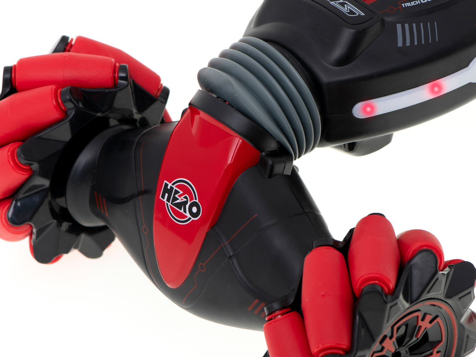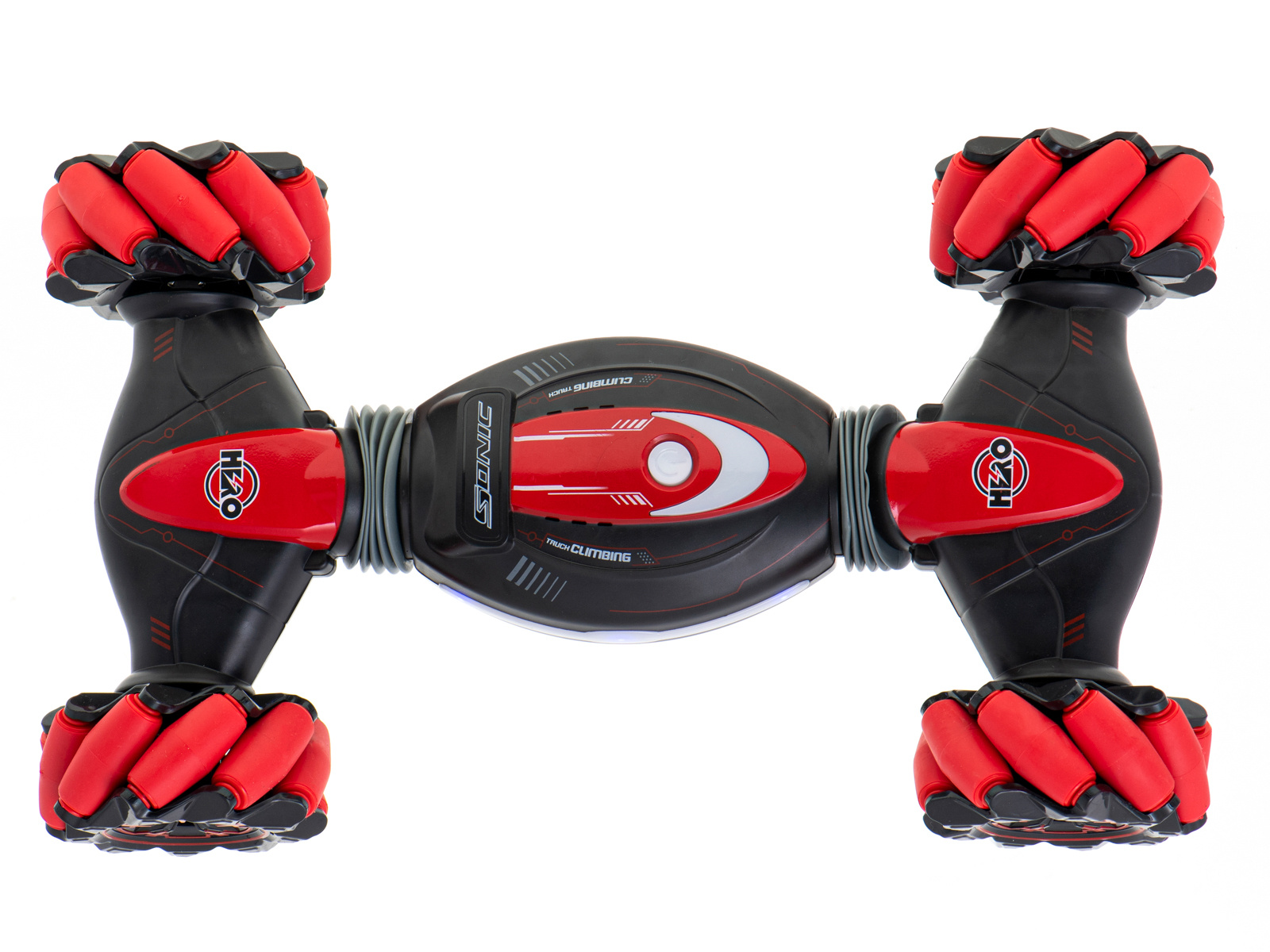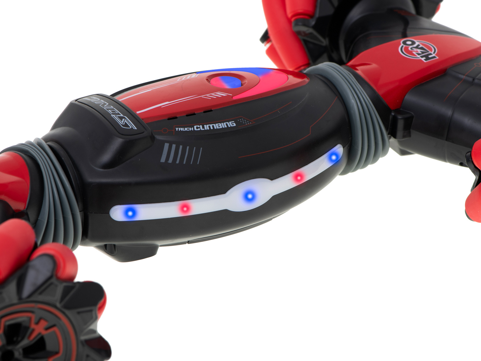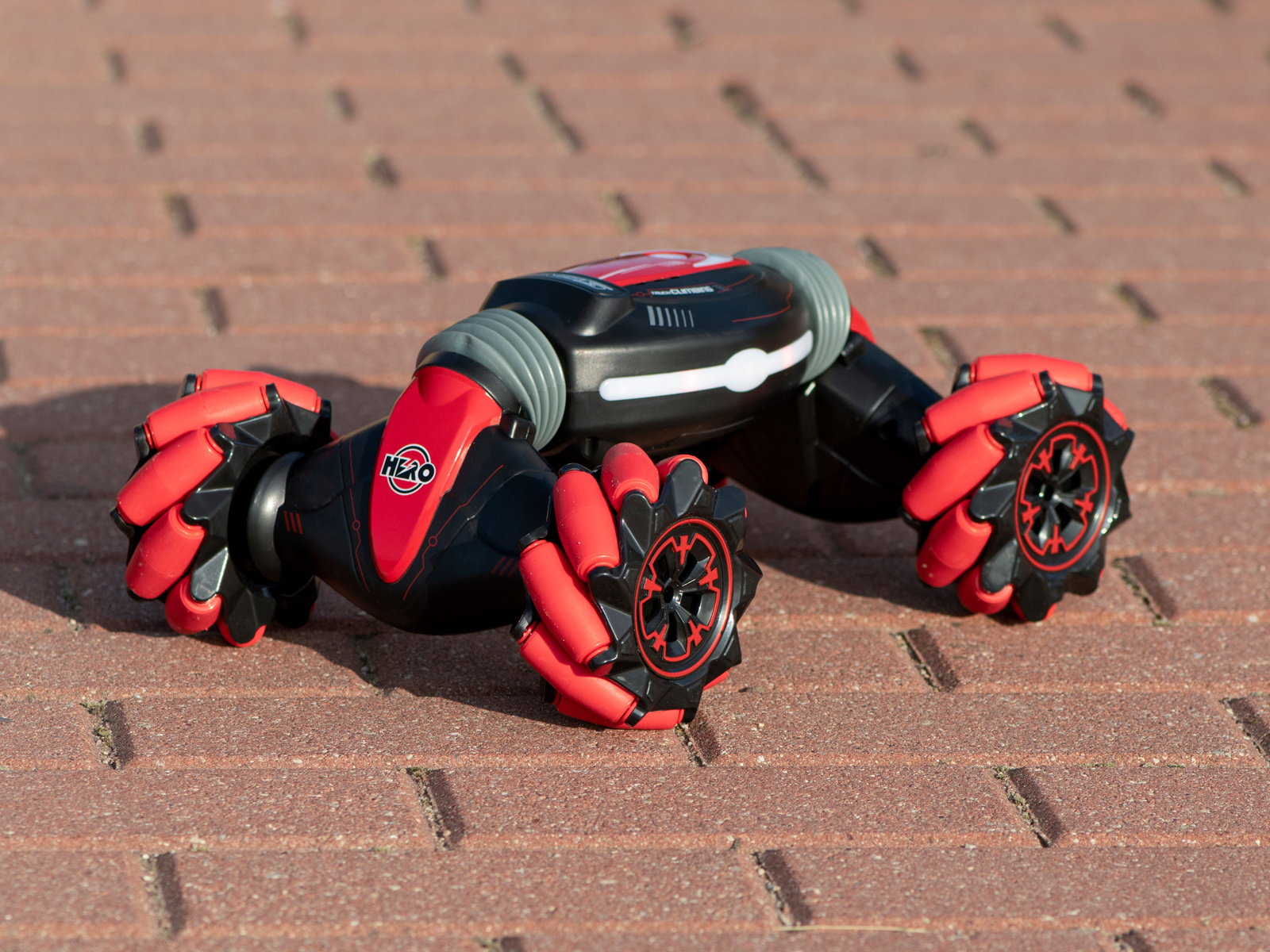 Niezwykła konstrukcja kół pozwala zabawce jechać na boki bez skręcania. Gumowe przeguby umożliwiają wspinaczkę.