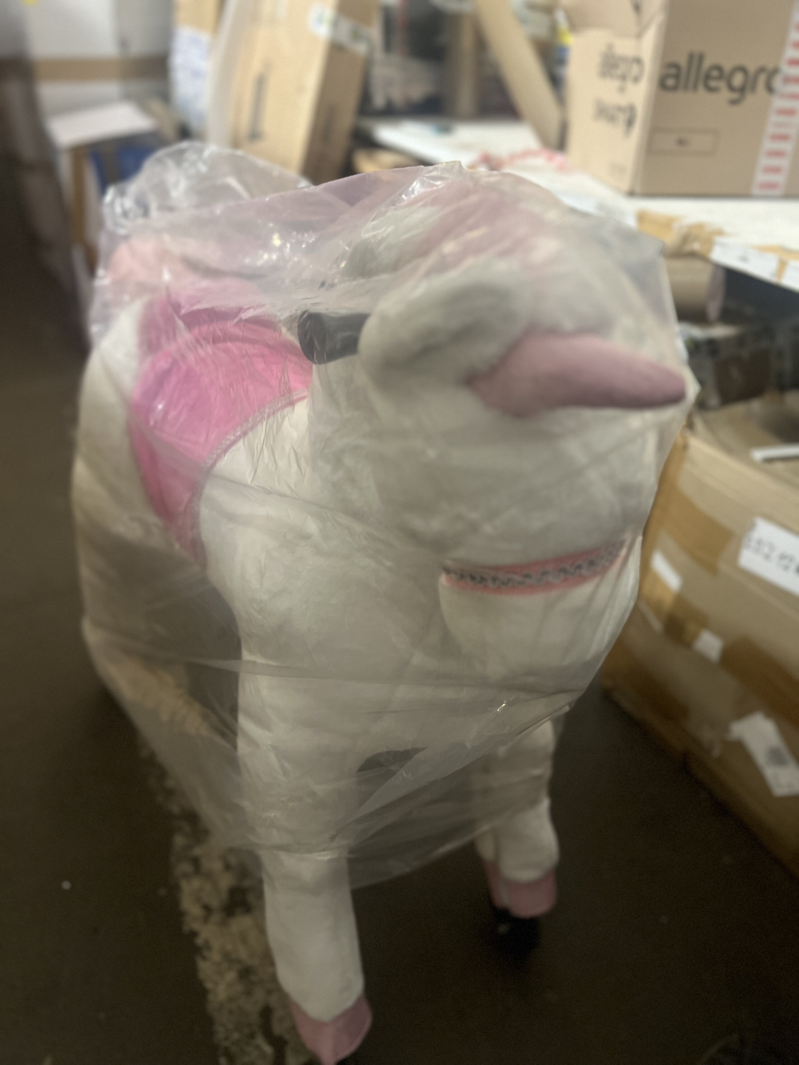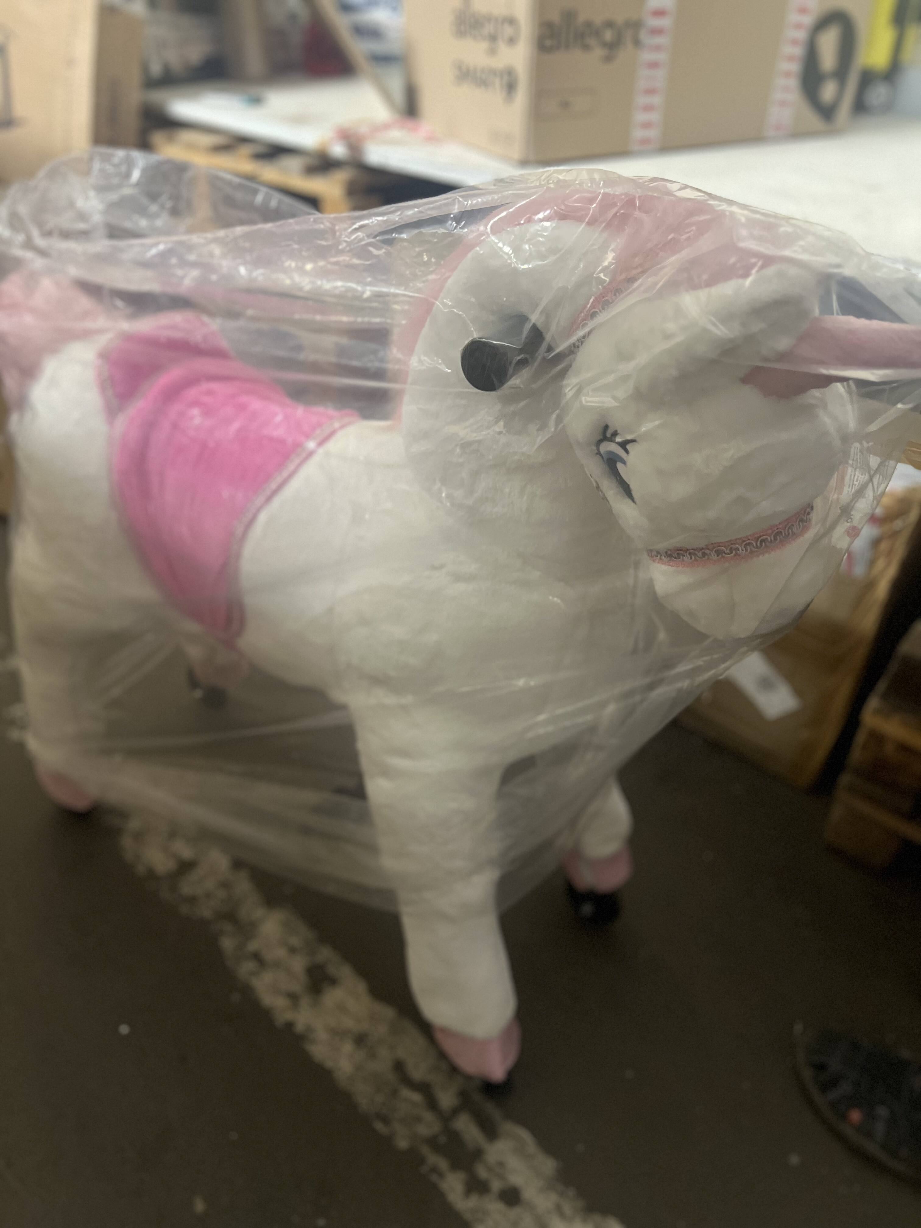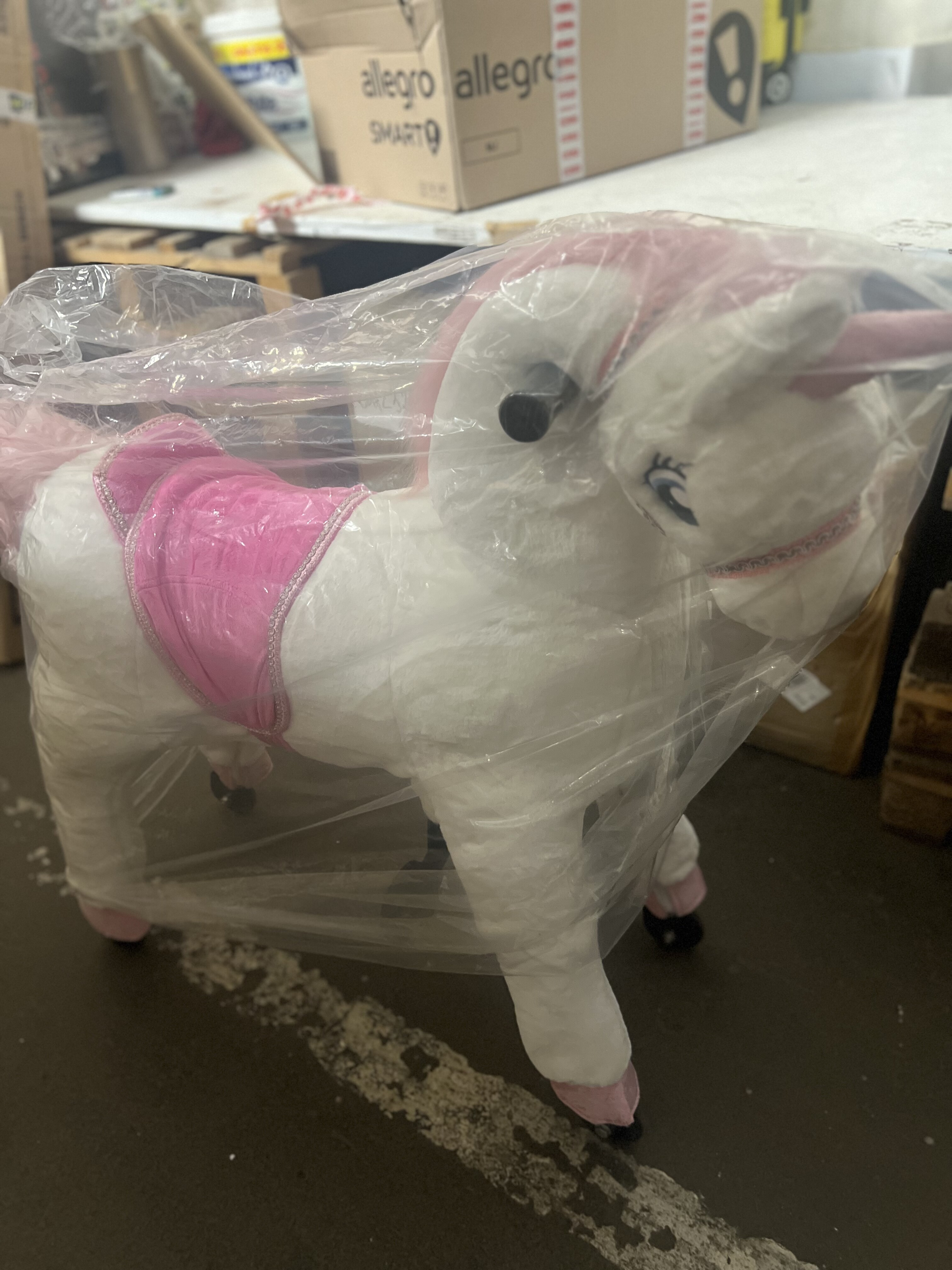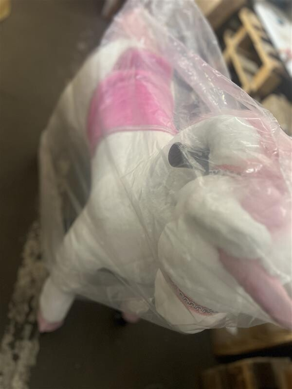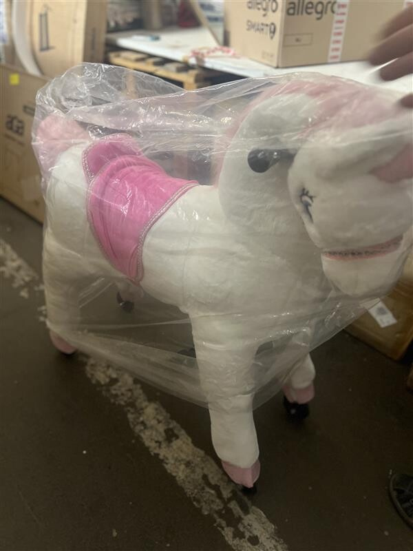 Dumnie wyglądający koń wierzchowy Jednorożec na kółkach. Koń zaczyna się poruszać, gdy jeździec porusza się prawidłowo. Koniem można kierować w prawo lub w lewo. Koń pokryty jest miękkim pluszem na powierzchni i dlatego jest bardzo przyjemny w dotyku. Wyposażony w zamki błyskawiczne i zdejmowaną powłokę zewnętrzną. Koń wyposażony jest w uchwyty i pedały. Solidna metalowa konstrukcja zapewnia stabilność i bezpieczeństwo podczas użytkowania. Nośność min. 25 kg do maks. 65 kg. Główne cechy: wysokość siodła 68 cm ruchy wahadłowe podczas jazdy trenują równowagę, koordynację i zwinność