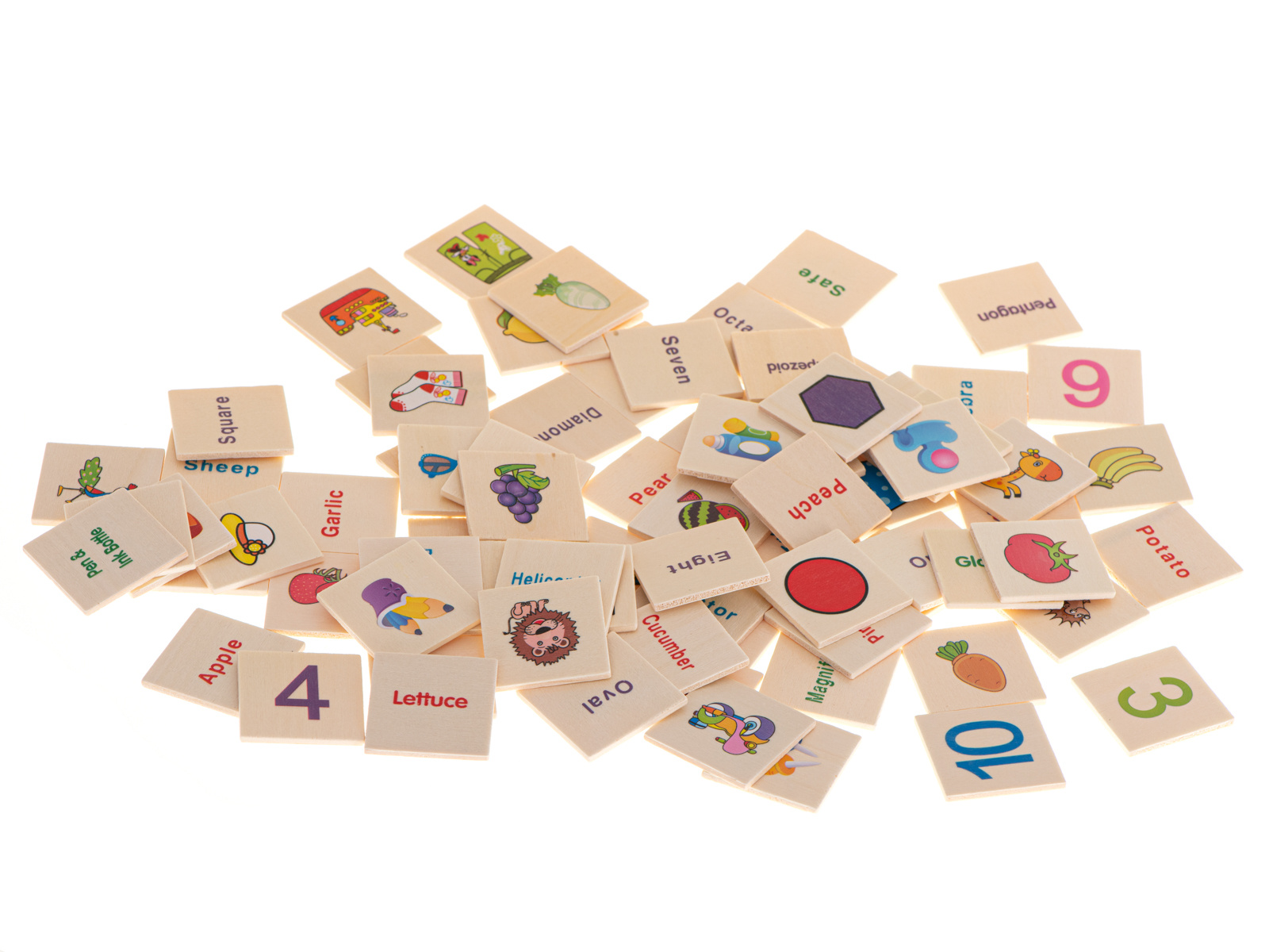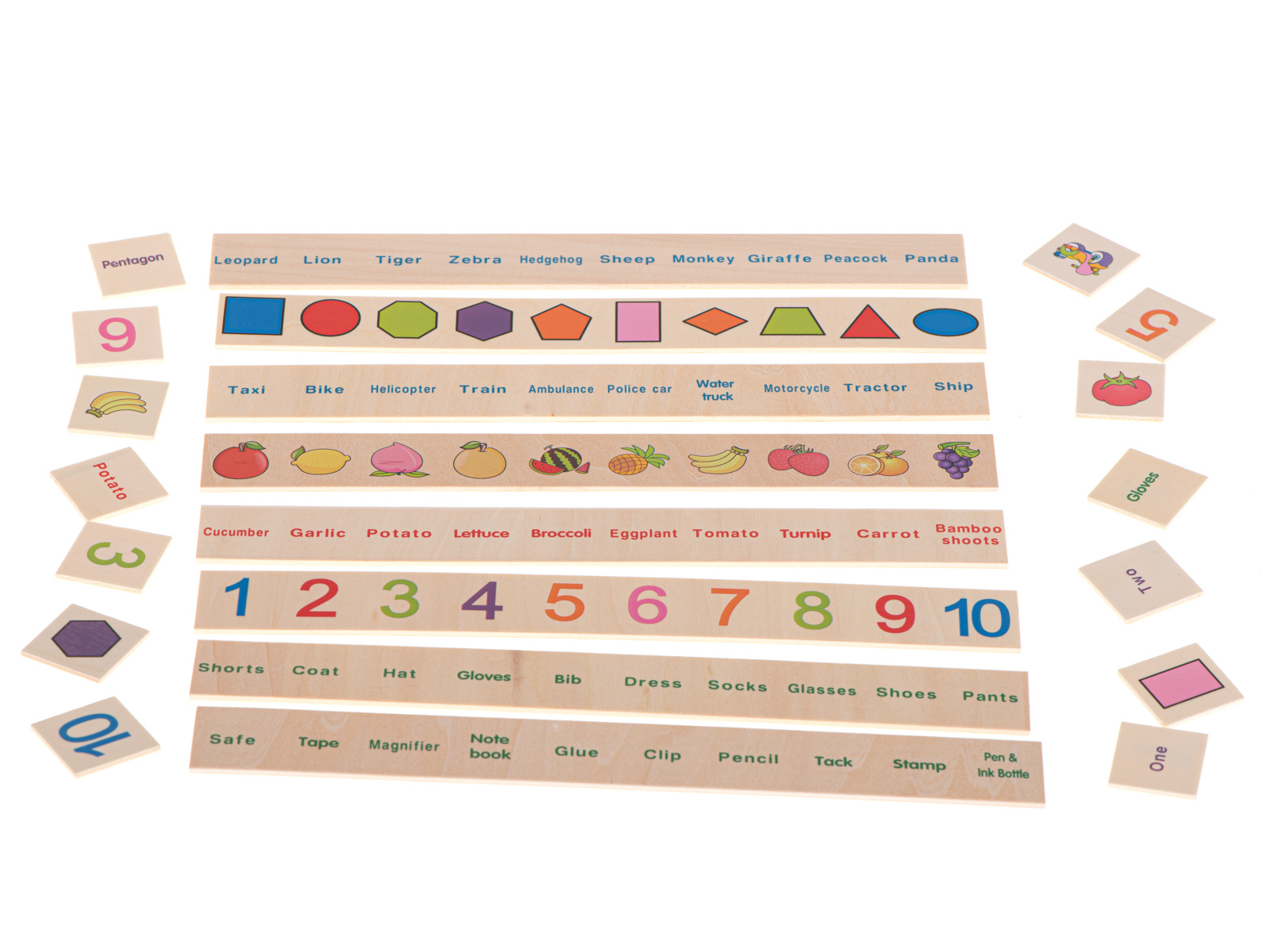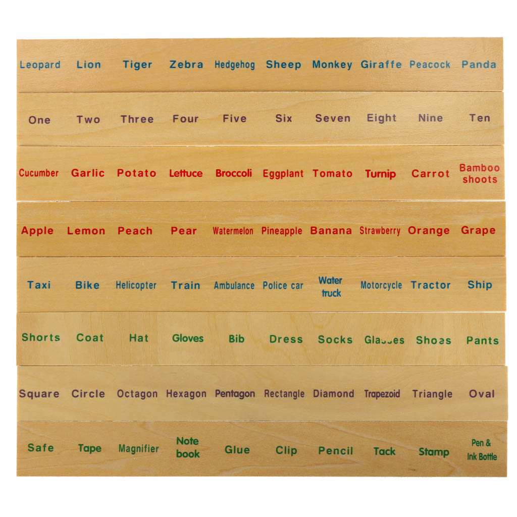 Na tabliczkach zostały umieszczone angielskie nazwy cyferek, zwierzątek, przedmiotów.