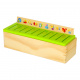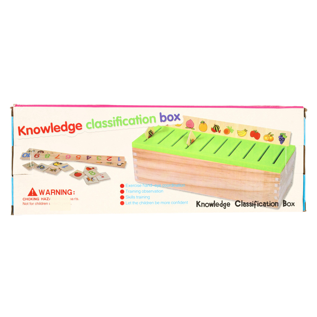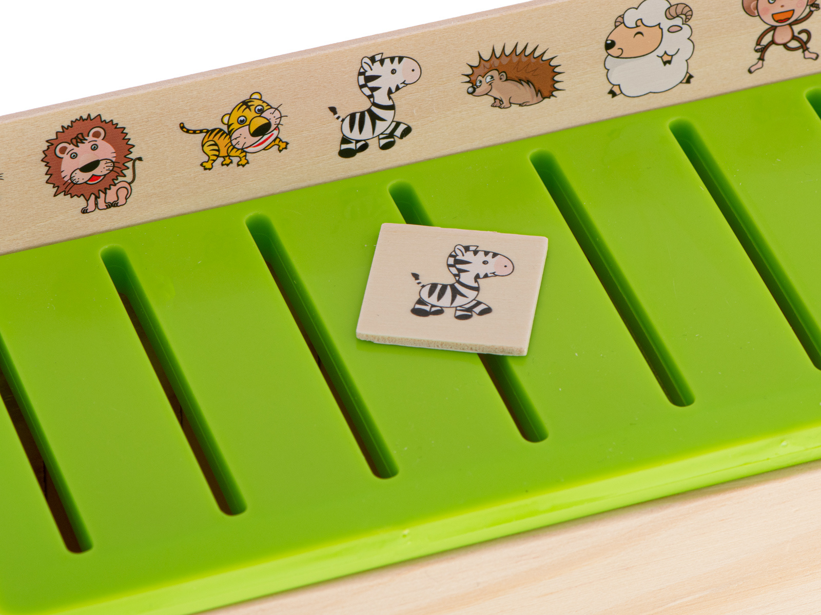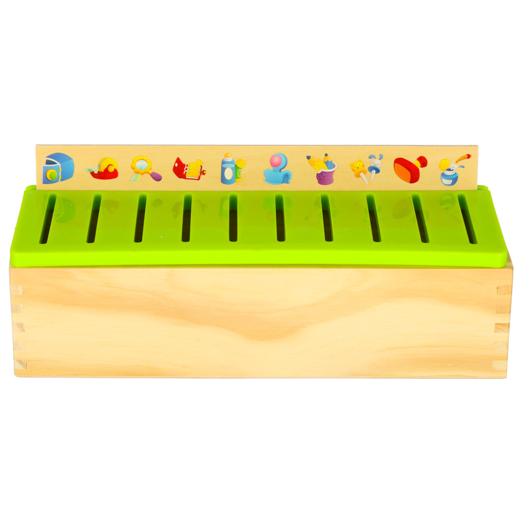 Zabawa polega na wrzuceniu w odpowiedni otwór takiego samego obrazka jaki jest umieszczony na dużej drewnianej tabliczce nad otworem.