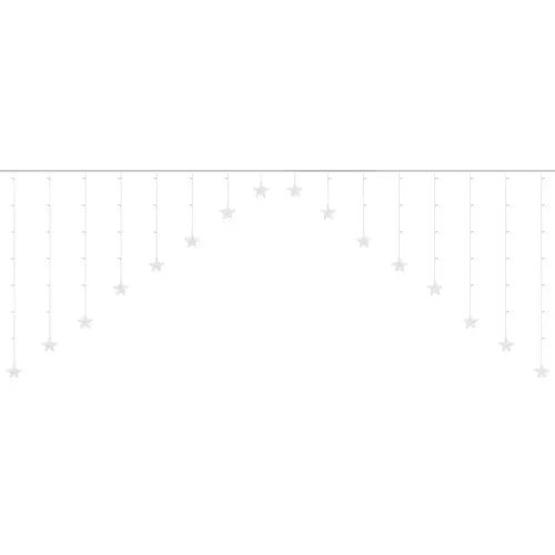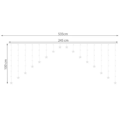 SPECYFIKACJA – ilość trybów: 8; rodzaj oświetlenia; LED; barwa światła: ciepłe białe; kolor okablowania: przeźroczysty; ilość diod: 136; klasa wodoodporności: IP44; pilot: tak; zasilanie: sieć energetyczna; moc: 1,2W; wymiary jednej gwiazdki: 9 cm; długość całkowita: 535 cm; długość sopla: 100 cm; waga: 0,388 kg; waga w opakowaniu: 0,494 kg.