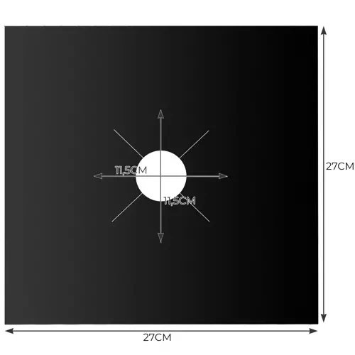 SPECYFIKACJA - Kolor czarny; materiał: teflon; średnica otworu: 4,5 cm - 11,5 cm; wymiary: 27 x 27 x 0,2 cm; waga: 90 g; waga w opakowaniu: 100g.
