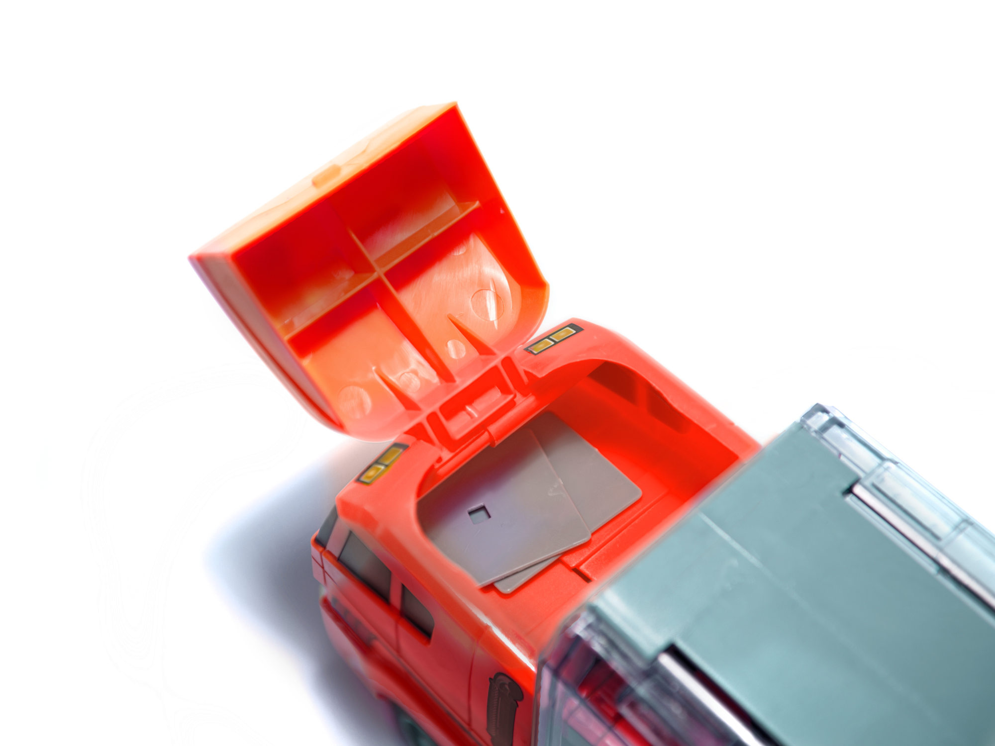 Transporter otwiera się z dwóch stron, z każdej zmieści się 6 aut. Duże przezroczyste drzwi zamkniesz małą blokadą. Dzięki temu pojazdy nie wypadną z ciężarówki w trakcie jazdy.