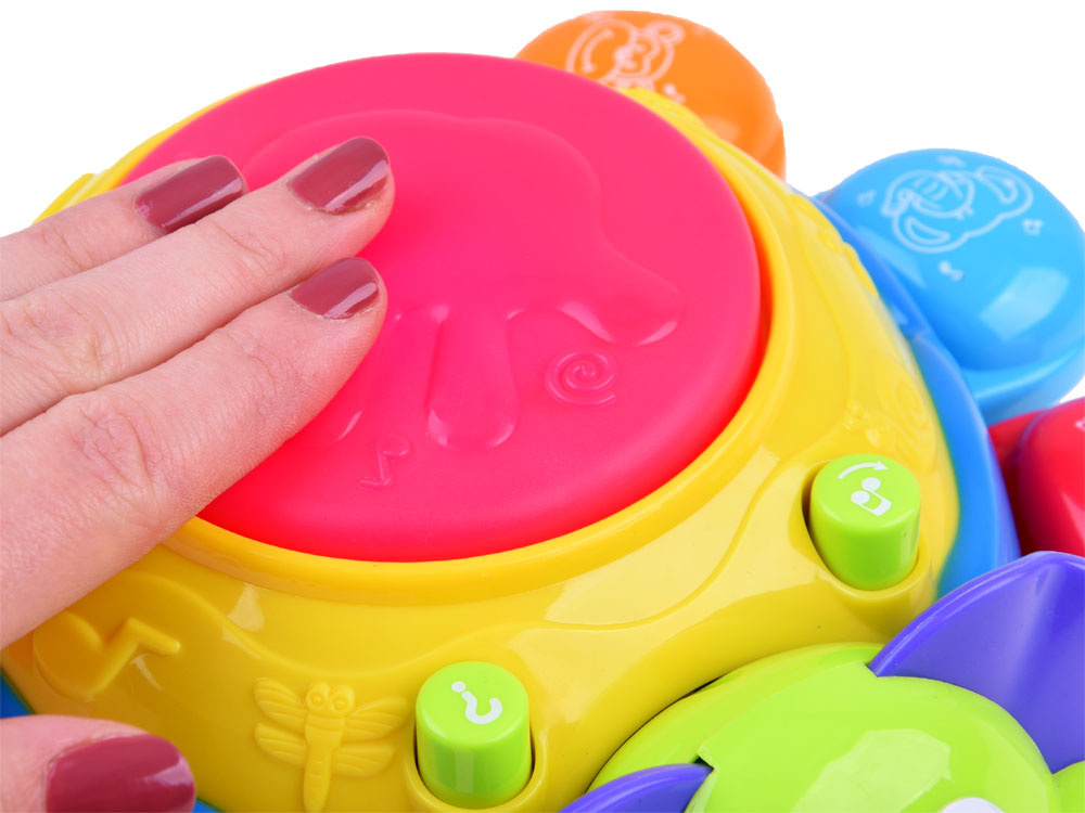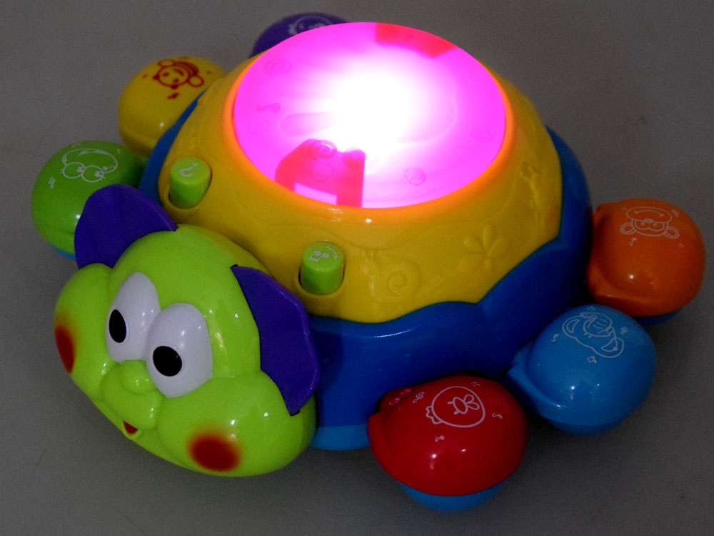 - na plecach robaczka przycisk z nutkami odpowiada za wesołe melodie, i migające światełko. Duży czerwony, podświetlany przycisk na plecach robaczka zmienia efekty dźwiękowe