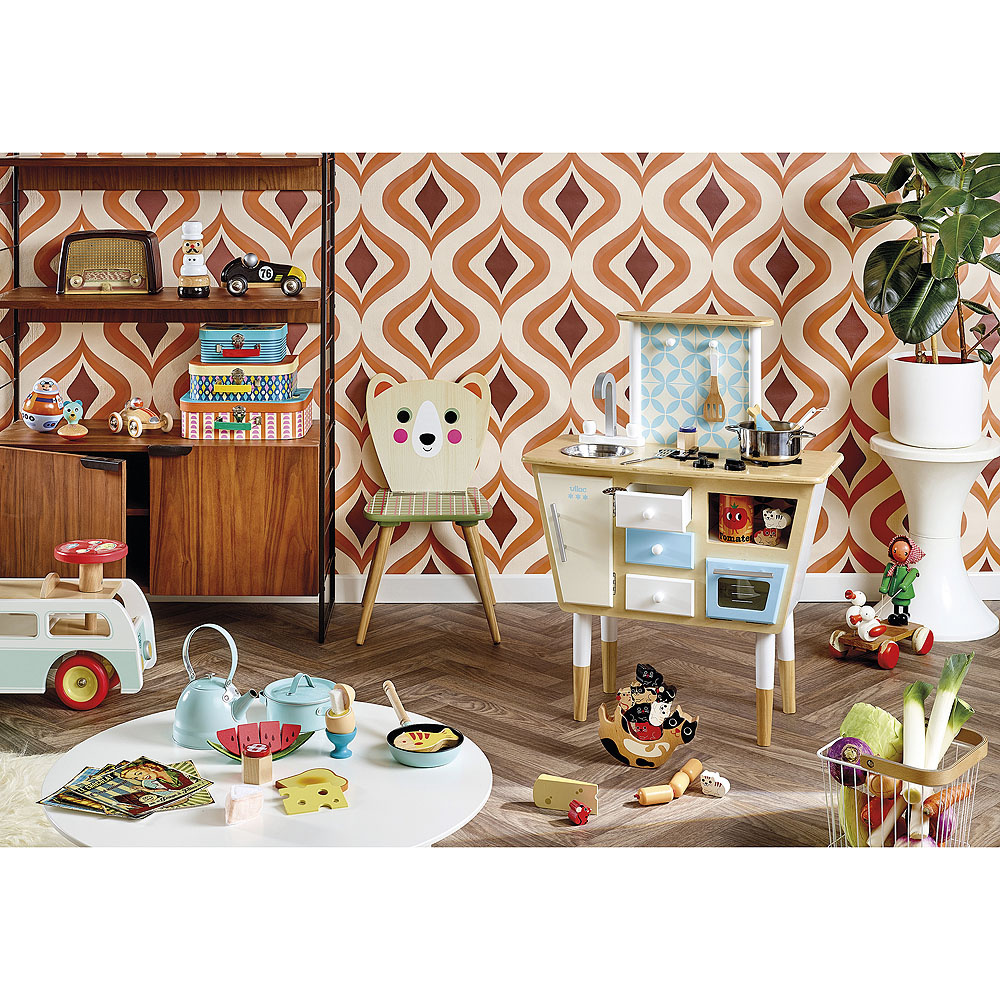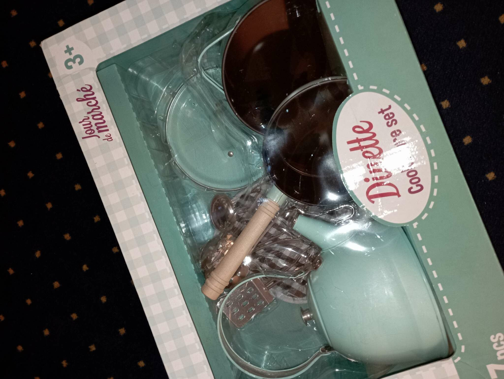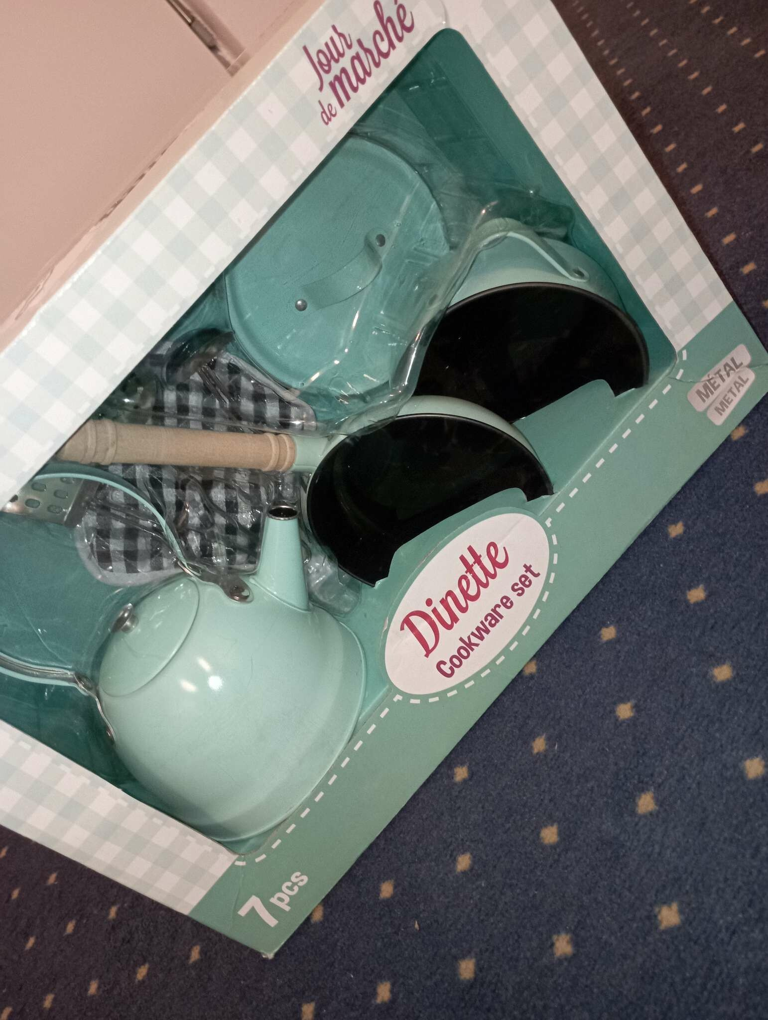 Zestaw kuchenny vintage wykonany z malowanego metalu, idealny dodatek do kuchni dziecięcych. Zawiera patelnię, garnek, czajnik, 2 rodzaje chochli i łopatkę oraz matę pod garnek. Główne cechy: nadaje się do każdej kuchni