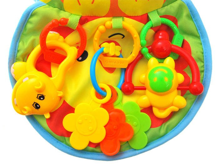 Żywe kolory zwrócą uwagę Maluszka i wspomogą zdolność rozróżniania kształtów i barw. Grzechotki pozytywnie wpłyną na rozwój słuchu i koordynację rączek- można pozwolić dziecku swobodnie nimi się bawić lub dopiąć do miękkiego wałka.