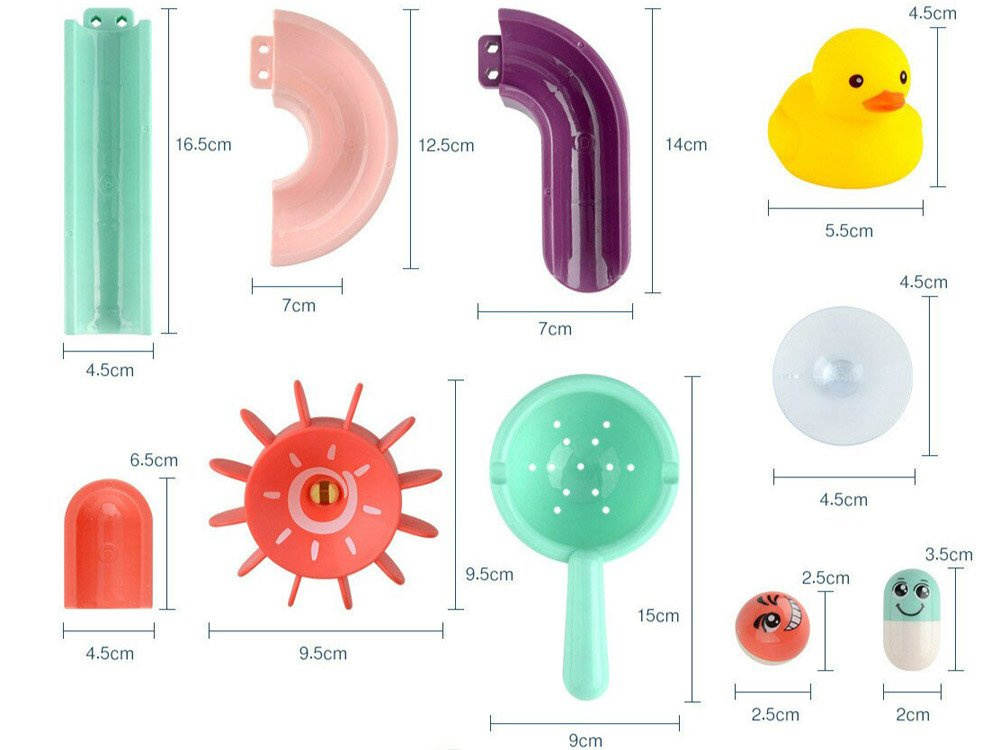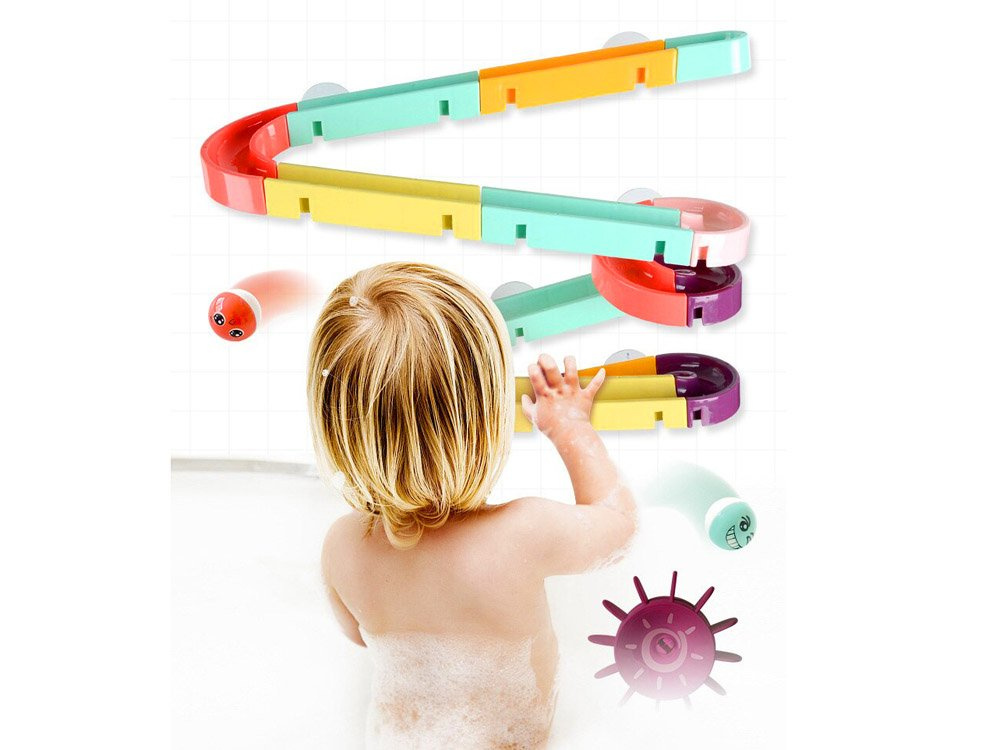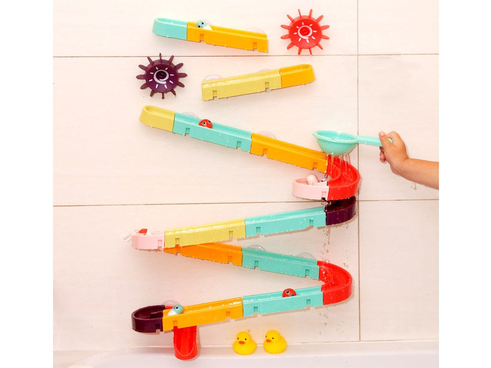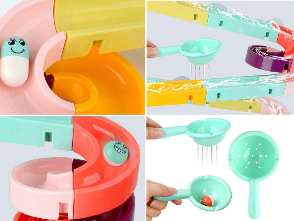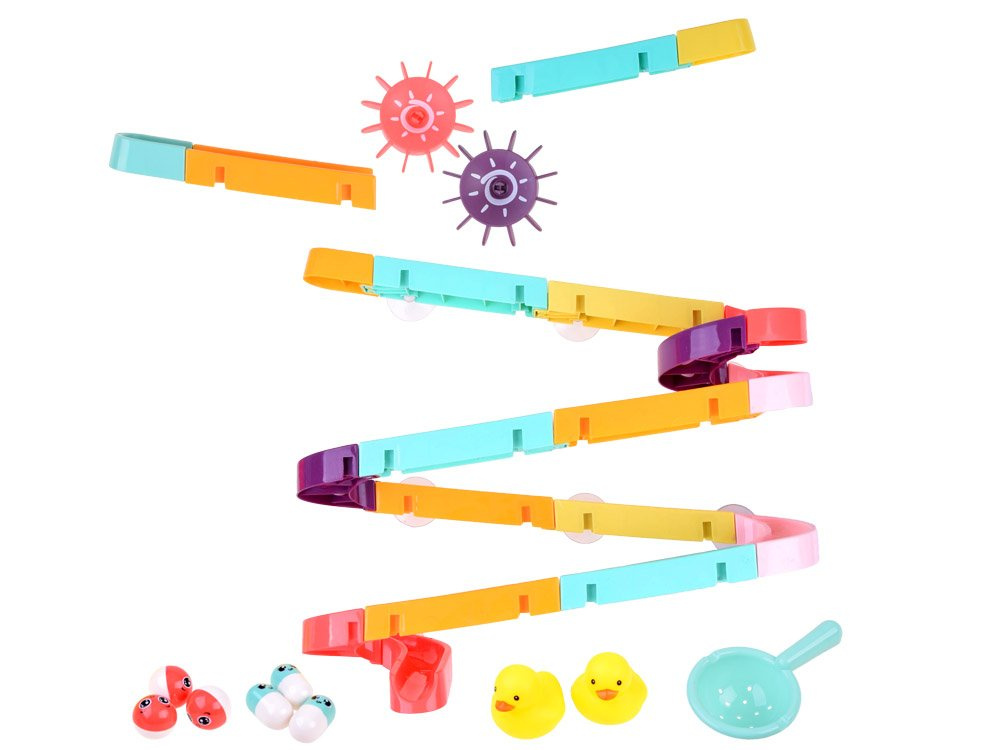 Zestaw składa się z 44 elementów, do zbudowania samodzielnie zjeżdżalni dla zabawek. Dzieci uwielbiają się pluskać w wodzie, a czasami nie lubią myć głowy, ale zachęcający tor zajmie ich zabawą i wówczas może uda się się umyć maluchowi włosy bez awantury.