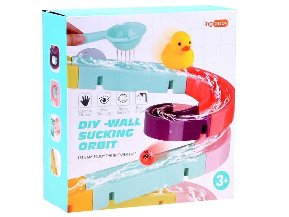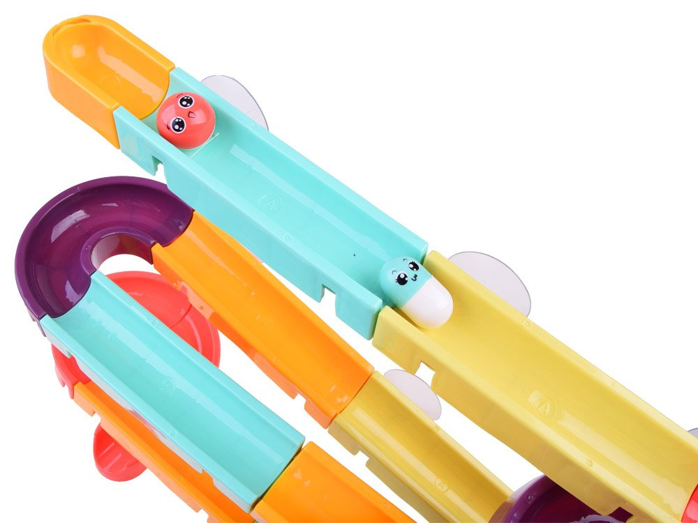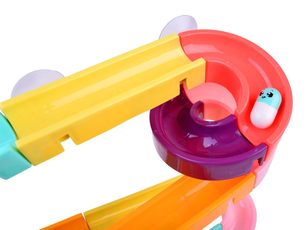 Kreatywny zestaw Tor ze zjeżdżalnią dla zabawek przeznaczony do zabawy podczas kąpieli. Zestaw wykonany jest z plastiku, posiada silikonowe przyssawki, dzięki którym tor można przymocować go do płytek w łazience. W zestawie są kolorowe elementy do zbudowania zakręconego toru, gumowe kaczki, kulki, fasolki i sitko.