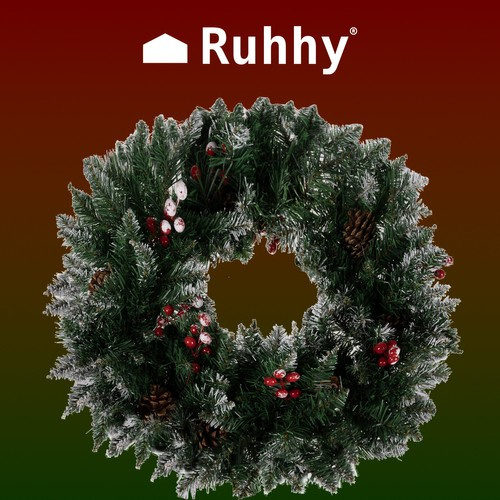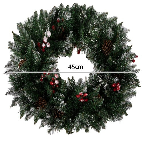 SPECYFIKACJA - materiał: igły: PVC, stelaż: żelazo ze sztuczną jarzębiną i szyszkami; średnica: 45 cm; długość gałązki: 12-14 cm; plastyczność (możliwość wyginania): tak; wewnętrzny / zewnętrzny: tak; waga: 0,7 kg; waga w opakowaniu: 0,858 kg.