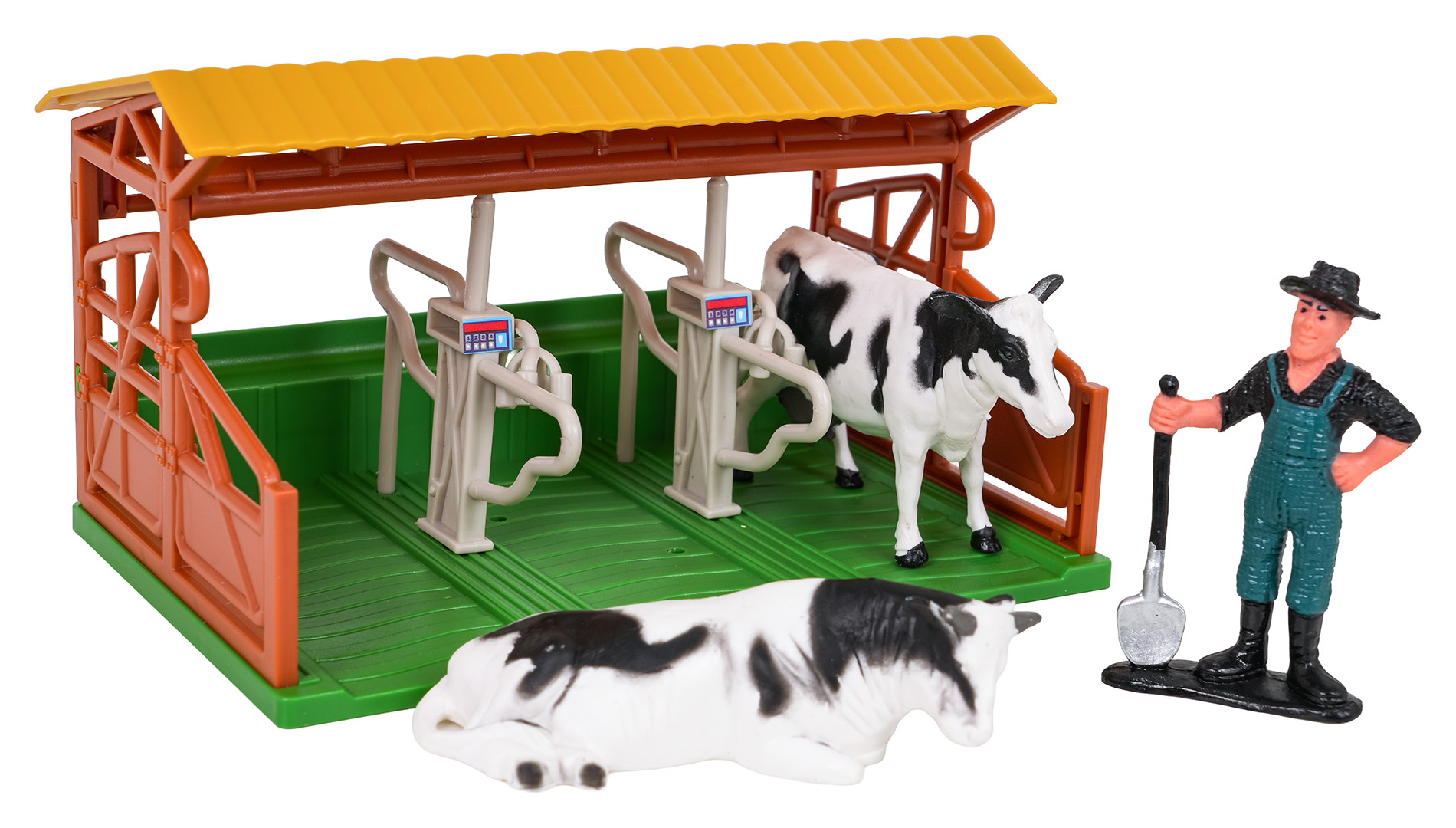 | Zestaw farma z interaktywnym traktorem, beczkowozem, zagrodą i figurkami dla dzieci od trzeciego roku życia. Zestaw wykonany został z najlepszej jakości plastiku w żywych kolorach. W zestawie znajduje się zagroda dla bydła, 2 krówki, figurka rolnika, drzewko, beczkowóz oraz interaktywny traktor z efektami dźwięku i światła. Traktor wydaje odgłosy jazdy, cofania, klaksonu (panel z przyciskami na dachu). Traktorek zasilany jest bateriami typu 3 x AG13 1,5 V (w zestawie).