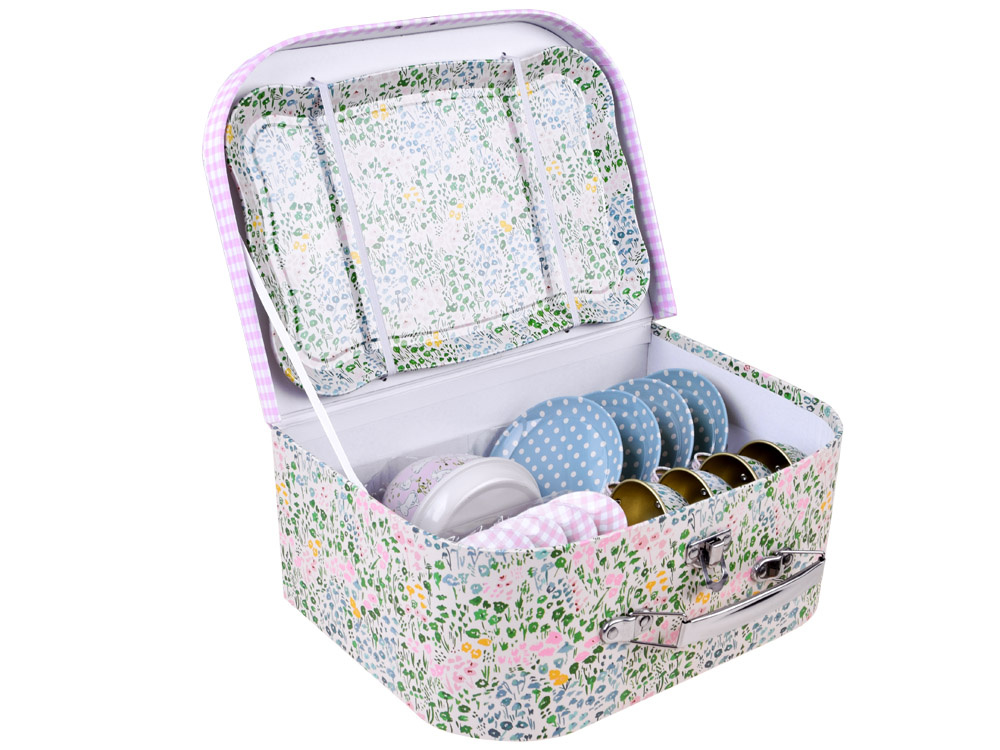 Kuferek wykonany jest ze sztywnej tektury w uroczej grafice łąkowo kraciastej z dodatkowymi metalowymi elementami, świetnie sprawdzi się też na pikniku, na placu zabaw, w parku.