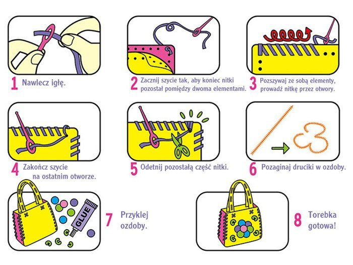 Super kreatywny zestaw do wykonania torebki. Każda dziewczynka lubiąca manualne prace typu wyszywanie, haftowanie, malowanie, dzierganie będzie zachwycona mając taki zestaw w swoich rączkach. Stwórz torebkę od podstaw, zaprojektuj kolorowe wykończenie i dodatki – a efekt końcowy miło Cię zaskoczy.