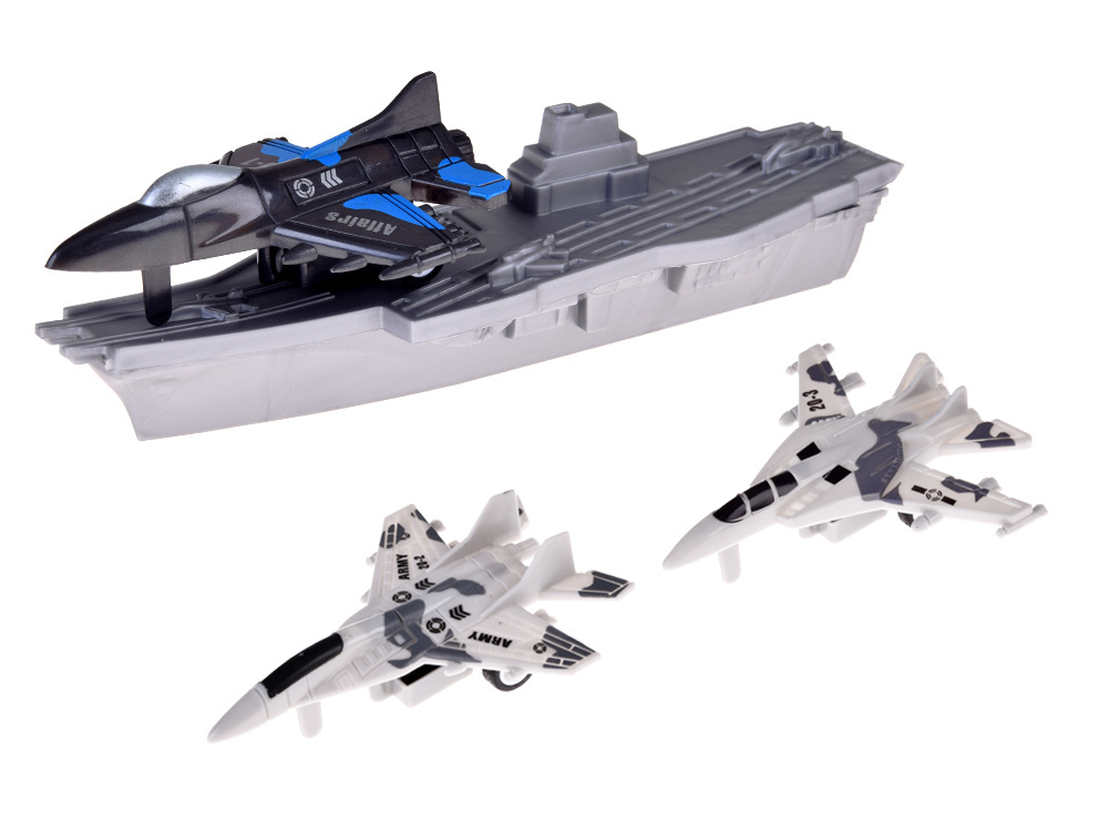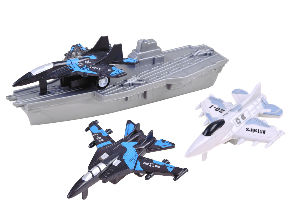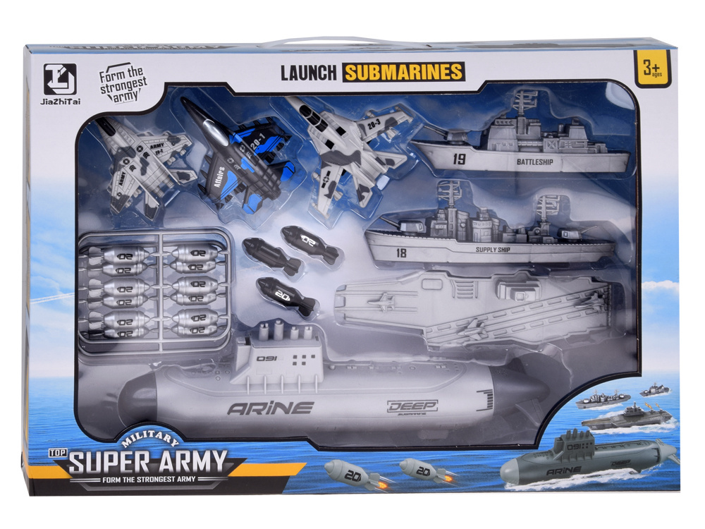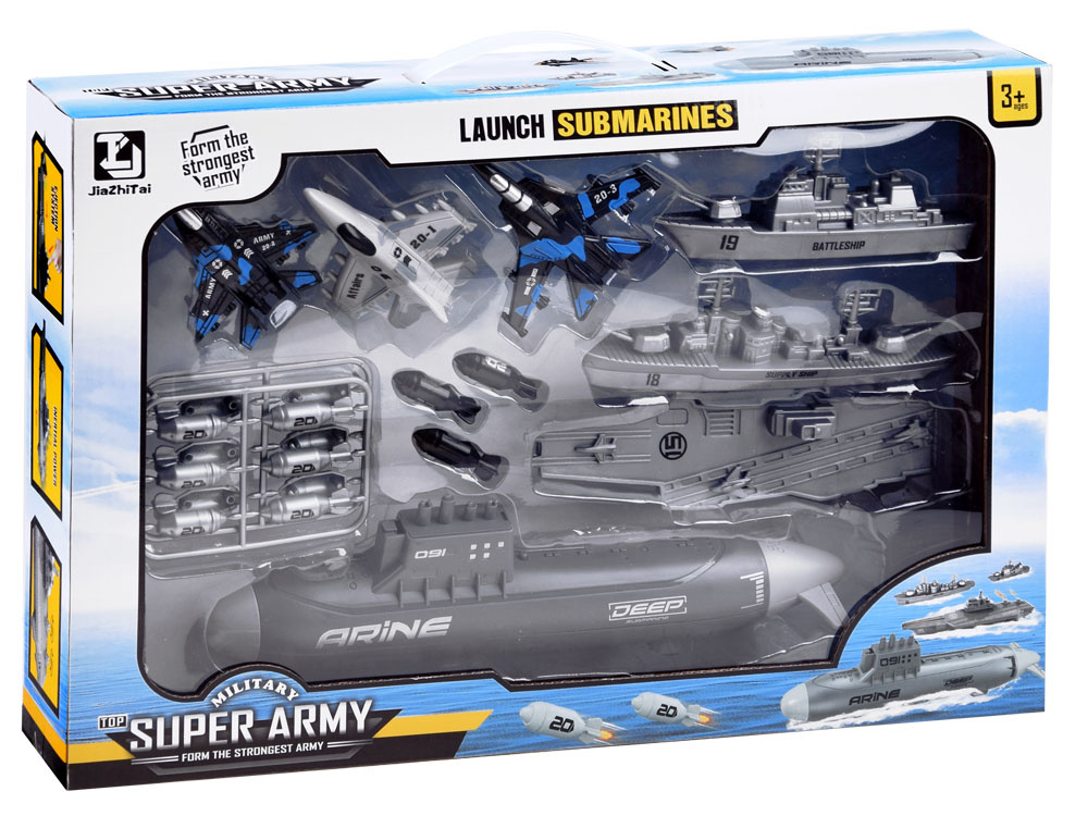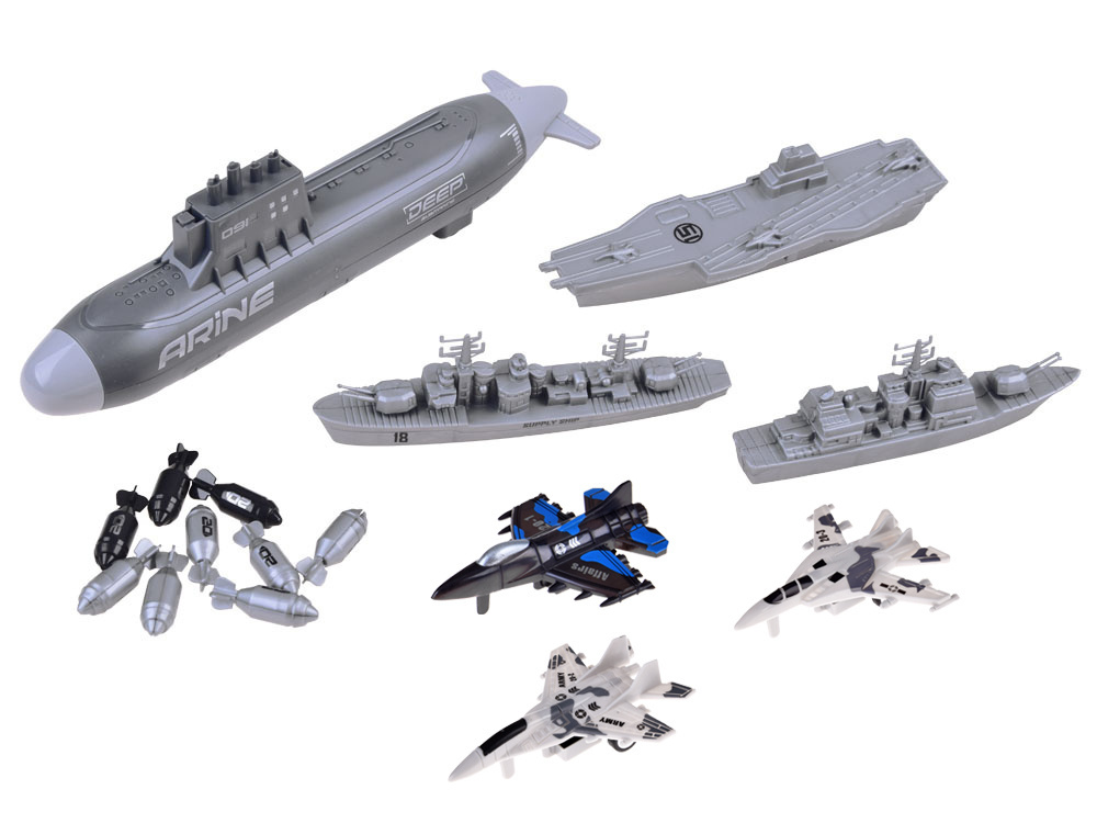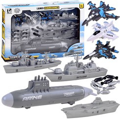 Zestaw małego żołnierza samoloty, statki wojskowe, łódź podwodna to wszystkie niezbędne sprzęty do prowadzenia działań batalistycznych. Mały strateg będzie miał do dyspozycji morską flotę oraz trzy samoloty bojowe patrolujące obszar z powietrza. Zestaw w całości wykonany został z plastiku w adekwatnej kolorystyce i grafice. Dodatkowo łódź podwodna posiada napęd na dwa tylne koła, dzięki czemu zabawa może być bardziej realistyczna.