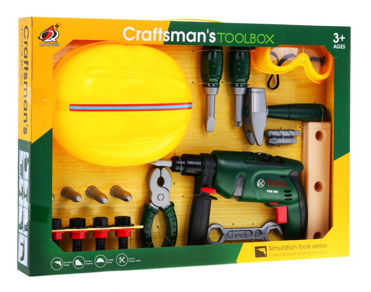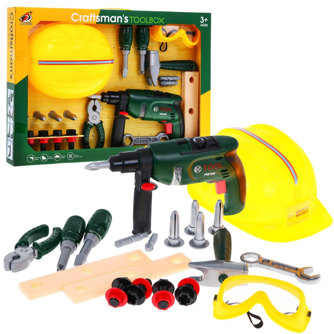 | | Zestaw majsterkowicza z wiertarką, goglami, kaskiem i narzędziami to propozycja dla dzieci od 3 – go roku życia. Zabawka pozytywnie wpływa na rozwój logicznego myślenia, pobudza kreatywność oraz wspomaga koordynację wzrokowo-ruchową. Wkrętarko-wiertarka zasilana jest bateriami typu 2 x AA 1,5V – brak w zestawie. |