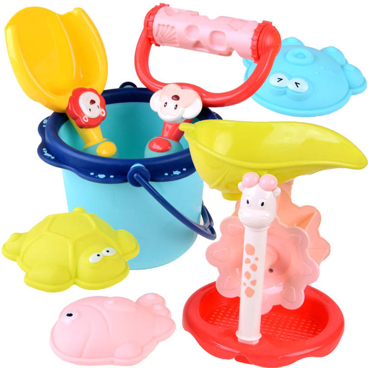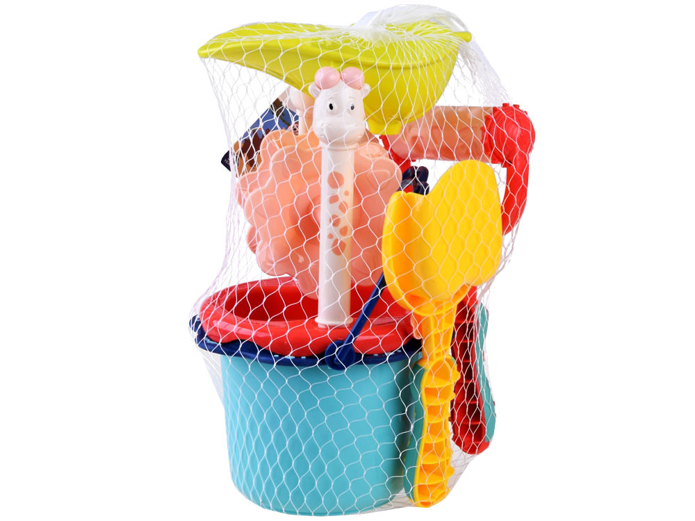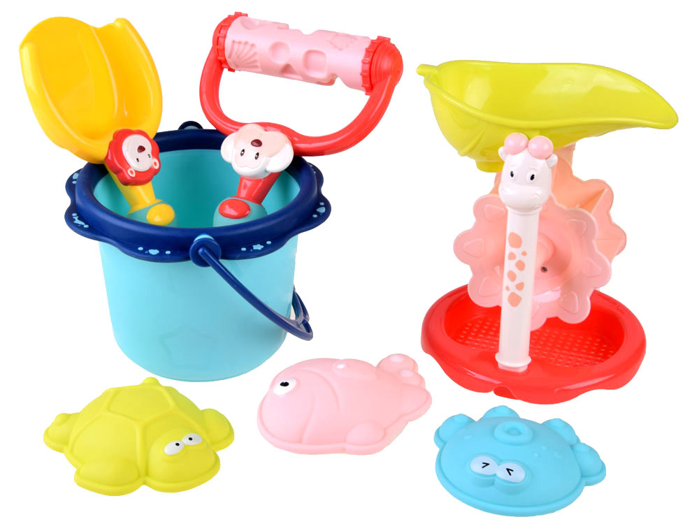 Kolorowy zestaw do piasku 7-el wiaderko, łopatka, 3 x foremki, sitko z kołowrotkiem oraz wałek to idealny zestaw który na pewno sprawdzi się podczas zabawy w piaskownicy, na placu zabaw, ogrodzie lub plaży.