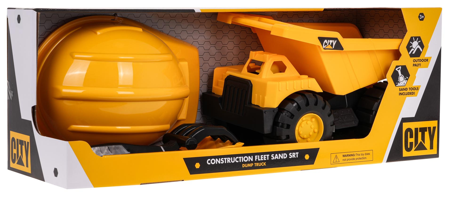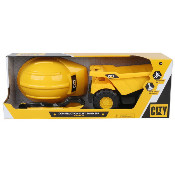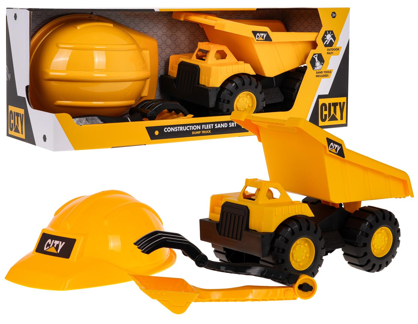 Zestaw do piasku z wywrotką, kaskiem, grabkami i łopatką dla dzieci od 3-go roku życia. Zestaw wykonany został z najlepszej jakości materiałów. Wywrotka posiada ruchome elementy. Manualnie możemy podnosić i opuszczać przyczepę. Duże koła umożliwiają jazdę po każdym terenie. Do zestawu dołączony jest kask dla małego budowlańca oraz grabki i łopatka do piasku.