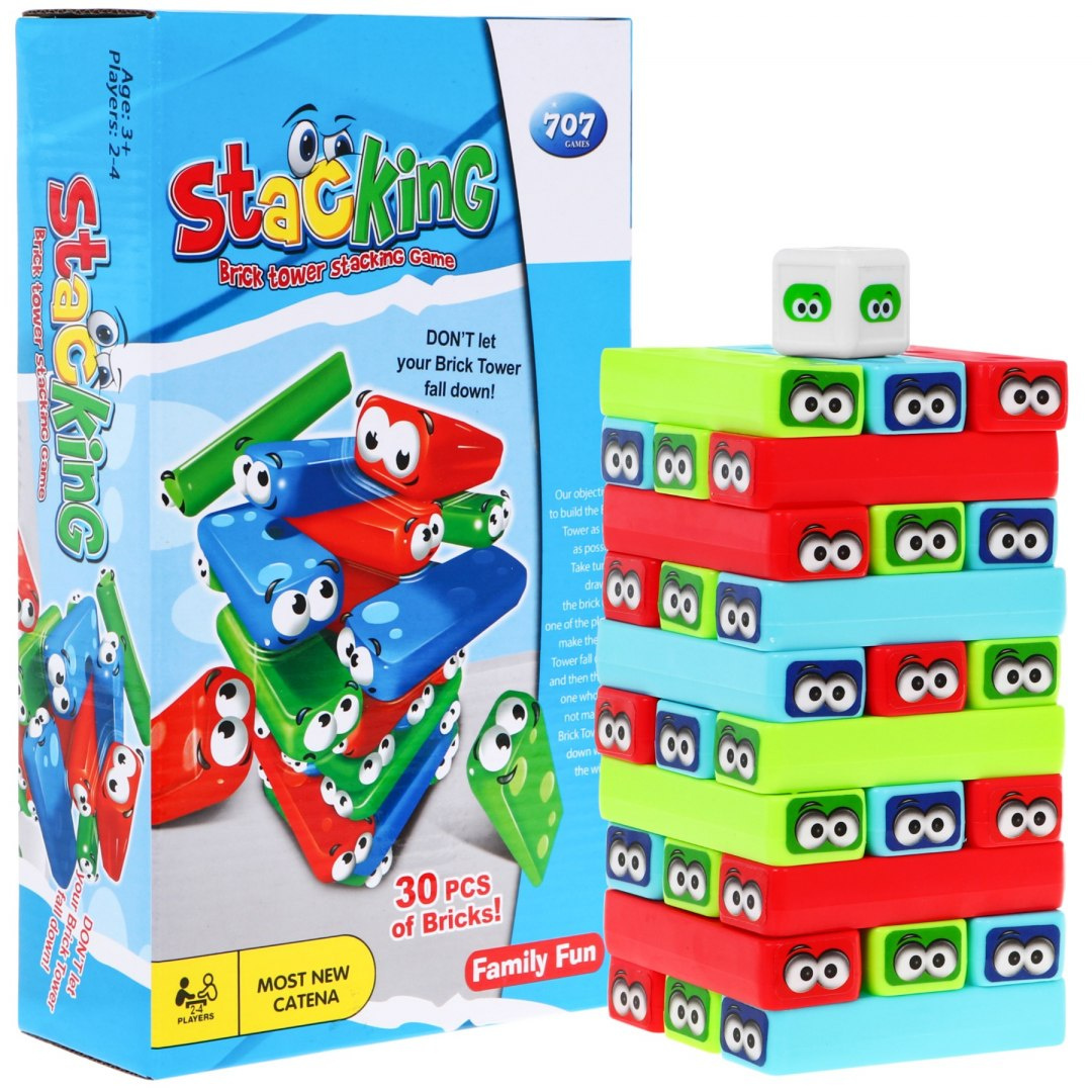 | - ułóż wieżę z klocków, w taki sposób, żeby w jednym poziomie znajdował się każdy kolor klocków, - grę rozpoczyna najmłodszy gracz, - rzuć kostką i wyciągnij z wieży taki kolor klocka jaki wylosowałeś i umieść go na szczycie wieży, - gracz, któremu zwali się wieża, przegrywa. | |